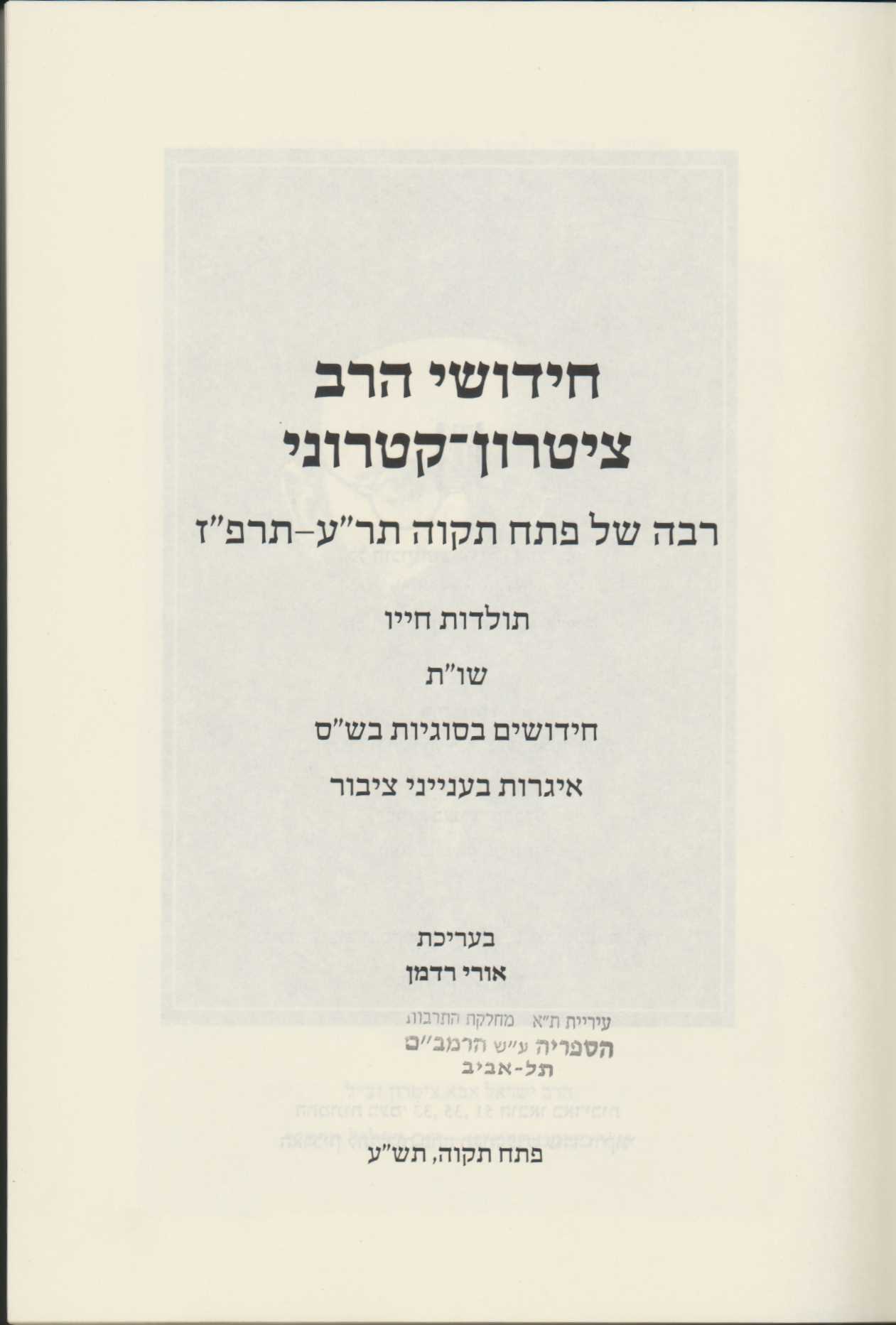 שלום וברכה. ראיתי את הספר הנפלא של הרב ציטרון שערכת בשנים האחרונות, ועוד טרם היה סיפק בידי להתיישב ולעיין בו במתינות הראויה. ייש"כ כמובן. שנה-שנתיים בטרם יצא הספר לאור (אף שכבר ידעתי על עצם הכנתו על ידך) ערכתי בעצמי מאמר תולדות קצר על הרב ציטרון, וכמובן עתה הוא מיותר, מתוך שאני מניח שעסקת בכך בהרחבה. (מה שעניין אותי בעיקר, בשעתו, היתה פרשת היחסים המורכבת שלו עם חותנו הרוגאצ'ובר. בעניין זה נפלו כותבי העבר בכמה שגיאות היסטוריות, דוגמת ייחוס קונטרס שבסוף צפנת פענח זרעים לרב ציטרון, בעוד שהוא נכתב על ידי גיסו הרב אבא דוד פיינגולד, וכן ההסבר לפיו המכתב עליו דיבר הרוגאצ'ובר עם בתו, ע"פ סיפור ידוע [1], היה זה שכתב בתרפ"ז נגד הראי"ה, בעוד שהדבר אינו יכול להיות ע"פ האמור בסיפור עצמו. וכיוצא בהנה).