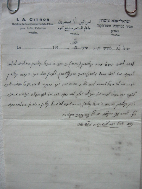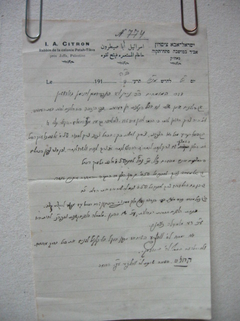 - לא ידעתי על מכתבו של ר' חיים ברלין שציינת, וייש"כ לך על הפניה זאת. בכלל נמנעתי מלכתוב על מינויו של הרב ציטרון לרב בפתח תקווה, מכיוון שהדבר לא עבר בצורה חלקה. בנו של הרב אורלנסקי (אברהם יעקב הי"ד) טען שהרבנות הזאת מגיעה לו והוא תבע את הרב ציטרון לדין תורה אצל הרב פרנק שפסק כנגד הרב ציטרון. בספר הר צבי זרעים (ח"ב סי' כ"ג) בעניין כלאים מתייחס הרב פרנק להסבר הרב ציטרון בפירוש הסוגיא של ערוגה, והדברים מובאים בספר באופן סתמי. מנגד מצויים בידי מכתבים ופסקי דין וחלוקת צוואה של הרב אהרון אורלנסקי בהם מוכח שכל המשפחה כולל כל האחים והאֵם באו לדון לפני הרב ציטרון, מדברים אלו נראה שהעניין היה קצת יותר מורכב. על יחסו של ר' חיים ברלין לרבנות הרב ציטרון, הערתי בספר שהיה עליו לחץ רב מבני המושבה למנות את הרב ציטרון. בכלל בני פתח תקווה העדיפו גם במקרה של הרב ציטרון וגם במקרה של הרב אברמסקי רב מחו"ל ולא רב בן הארץ. והיו מבני היישוב הישן שהתמרמרו על כך. הדבר צ"ע, מדוע הן נמנעו ומה היה יחסו של הרב קוק לכך.