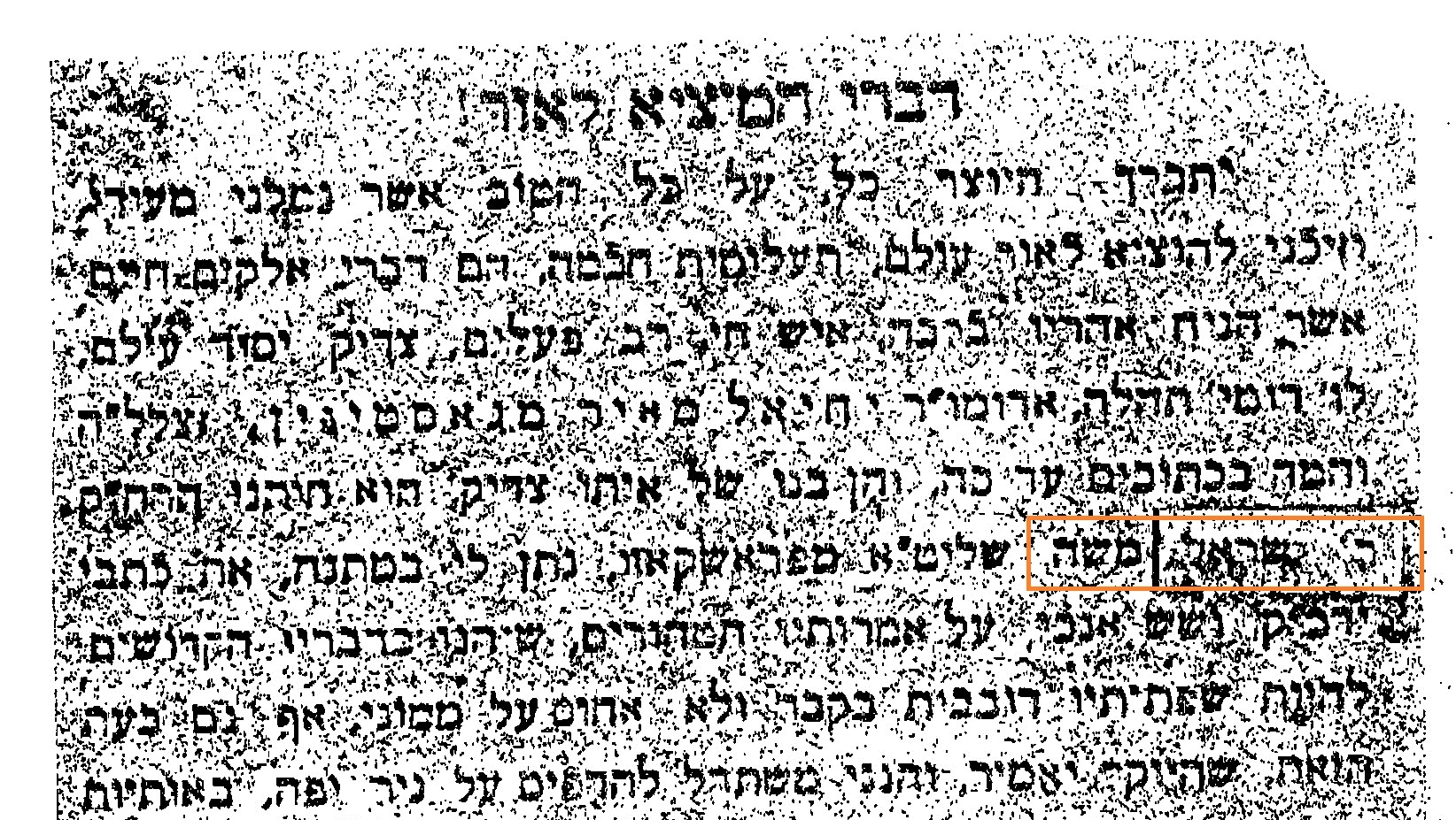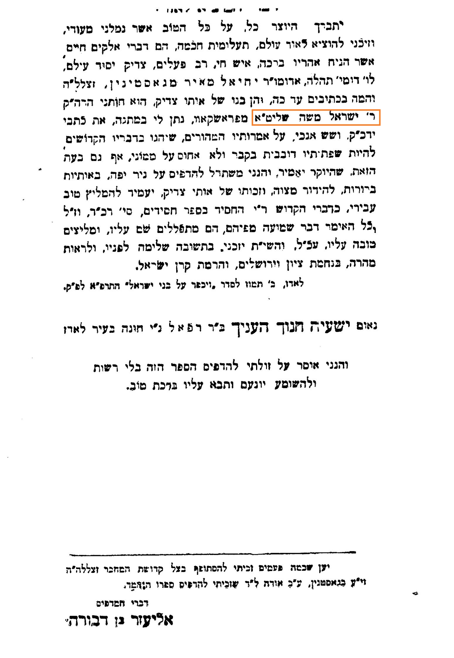 הכל מתחיל בעובדה ששמו של בן הרבי מגוסטינין, חמיו של המו"ל הראשון, ומי שכאמור העניק למו"ל את כתב היד הייחודי והנדיר, כלל לא היה 'אברהם משה' כפי שנדפס בתוך דברי הכרת הטוב שבפתח הספר, אלא 'ישראל משה'. מכיוון שהגיע אלינו יותר מספר אחד בו נכתב השם השגוי וכך נמכר, אפשר רק לשער את מידת עגמת הנפש שאחזה במוציא לאור. את גודל המהומה שירדה על ראשי המסדרים בדפוס אפשר רק לנחש.