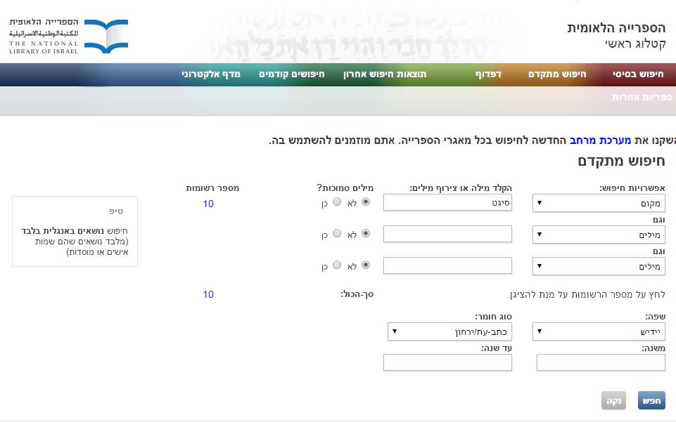 לאחר התלבטויות והתחבטויות בעניין זה מצאתי את הפתרון הבא אשר הסתמך על האפשרויות שמאפשרת תוכנת החיפוש של הספרייה הלאומית. בשלב ראשון, תוך היעזרות באטלסים היסטוריים, הכנתי רשימה של 25 עיירות במזרח ומרכז אירופה שאוכלוסייתן היהודית הייתה דומה לזו של סיגט. לאחר מכן, באמצעות אפשרות החיפוש המתקדם הגבלתי את החיפוש לשם מקום דפוס מסוים, לחיפוש בתוצאות עברית או יידיש, לסוגה מסוג ספר או כתב-עת ולתקופה שהסתיימה בשנת 1944 (השואה). בסוף התהליך נותרה בידי טבלה שבה לצד כל מקום דפוס יכולתי להציב הן את מספר הספרים בעברית וביידיש שנדפסו בו וכן את מספר העיתונים.