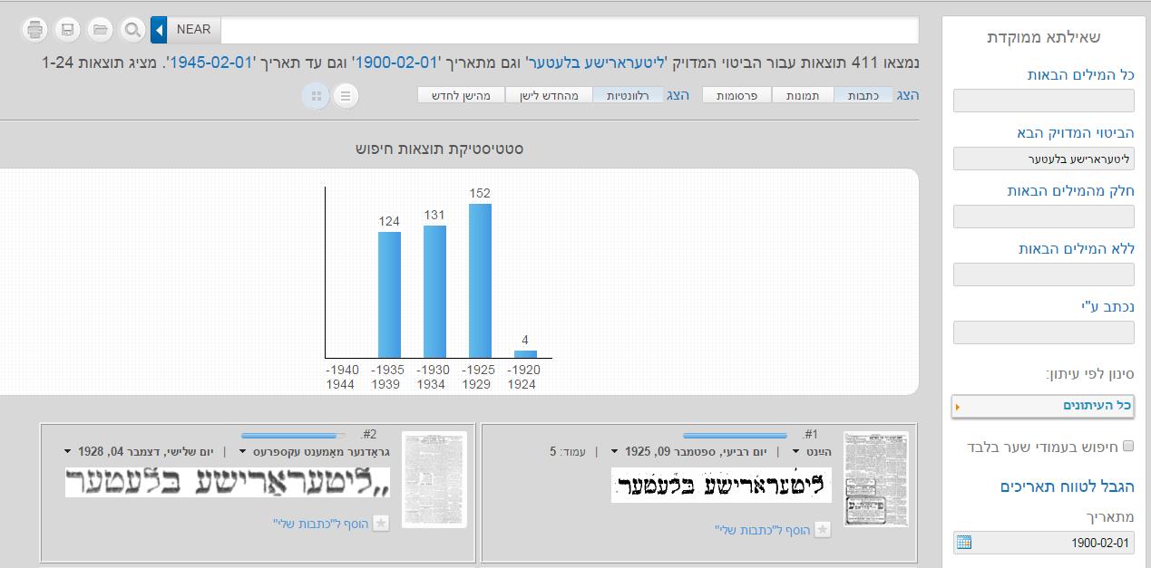 המקור השלישי שבו השתמשתי היה פרויקט עיתונות יהודית היסטורית. בו ניצלתי את מנגנון החיפוש לספירת את מספר האזכורים של הכותרים הספרותיים. כאן זכו העיתונים הספרותיים החשובים למאות אזכורים (בעיקר במקביל לשנים בהן התפרסם כתב העת), בעוד העיתונים השוליים יותר זכו לאזכורים מעטים יותר.