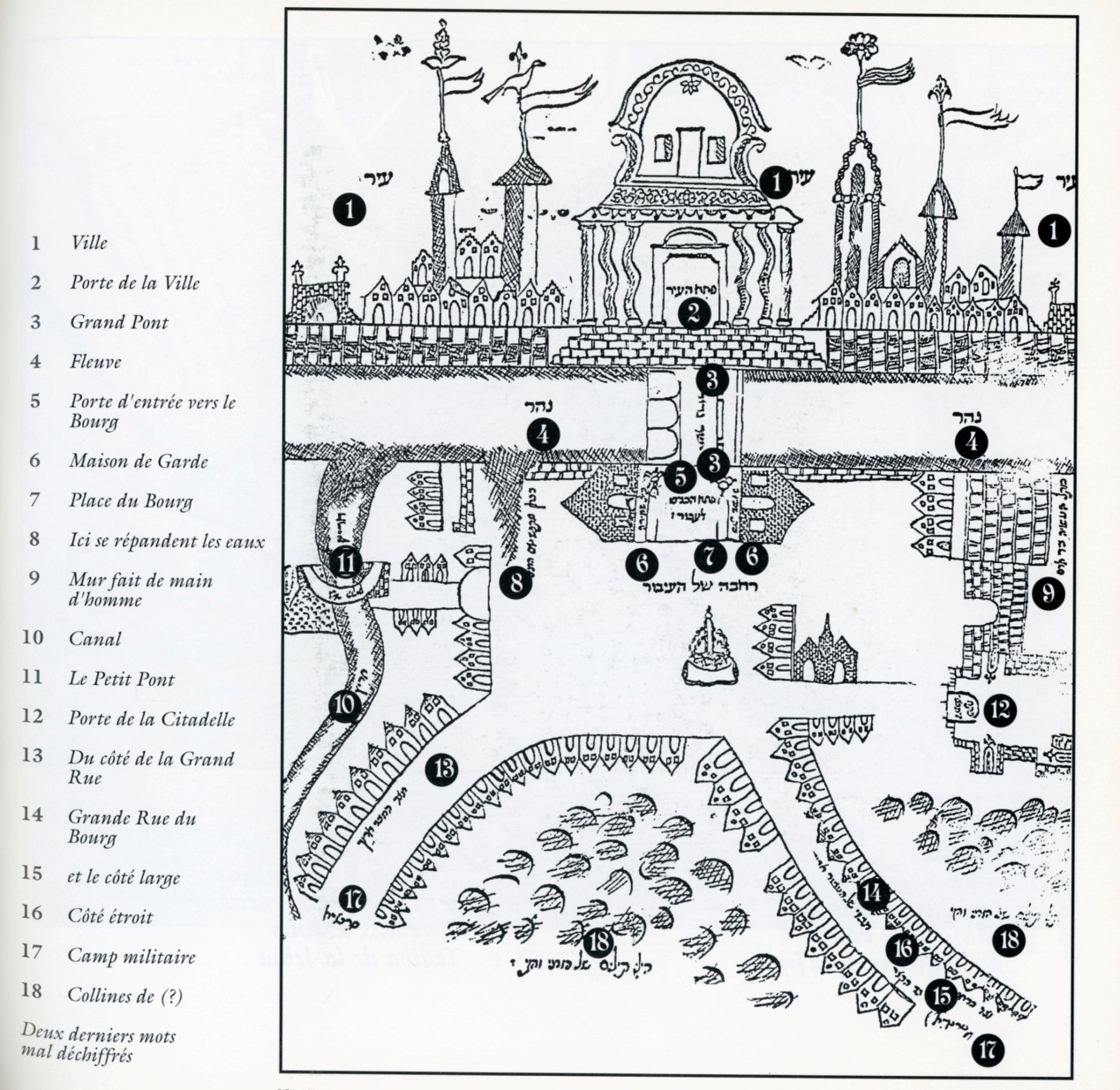 בציור ניתן לראות יפה את מבנה העיר וסביבותיה. ולהלן נוסח הכיתוב על המפה: ים, שרטון הארוך, שרטון הקצר, שפת הים, מגרש, עיר מוקפ'[ת] חומה, בין החומות, חומת-העיר.