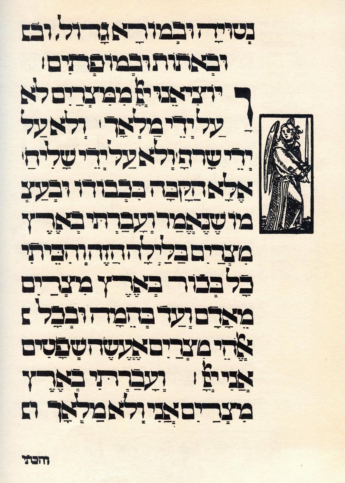 המלאכים מתוארים במקרא כאוחזי-חרב, וכמה מאיירים ציירו זאת באופן משכנע למדי. מלאך נושא חרב נראה לאתונו של בלעם (במדבר כב,כג): 'ותרא האתון את מלאך ה' נצב בדרך וחרבו שלופה בידו', וכו'. כיוצא בו, יהושע ראה את המלאך, שר צבא ה', 'וחרבו שלופה בידו' (יהושע ה,יג). כך גם לאחר המִפקד של דוד בא נגף על ישראל ולאחר שנענש ישראל ודוד הודה בחטאו, כתוב כך (דה"א כא,כז): 'ויאמר ה' למלאך וישב חרבו אל נדנה'. הדרשנים סברו שלמלאך המוות יש חרב בידו (עבודה זרה כ ע"ב), ולדעת אחד הדרשנים (דברים רבה יא,י) נשלח המלאך סמאל על ידי הקב"ה להביא את נשמתו של משה, ובתפקיד זה הוא שלף את חרבו והתכוון למלא שליחותו האלוהית. לפי ספר היכלות רבתי המלאך קצפיאל שומר על פתח היכל שישי במרום, וחרבו שלופה בידו. תמונתו של מלאך אוחז חרב מופיעה בהגדה של פראג רפ"ז (1527), ההגדה הראשונה שנדפסה עם איורים. המעניין בתמונה זו הוא שהמלאך נראה אוחז את חרבו בידו השמאלית, וייתכן שהיד 'התהפכה' בתהליך הייצור של הגלופות וההדפסה.