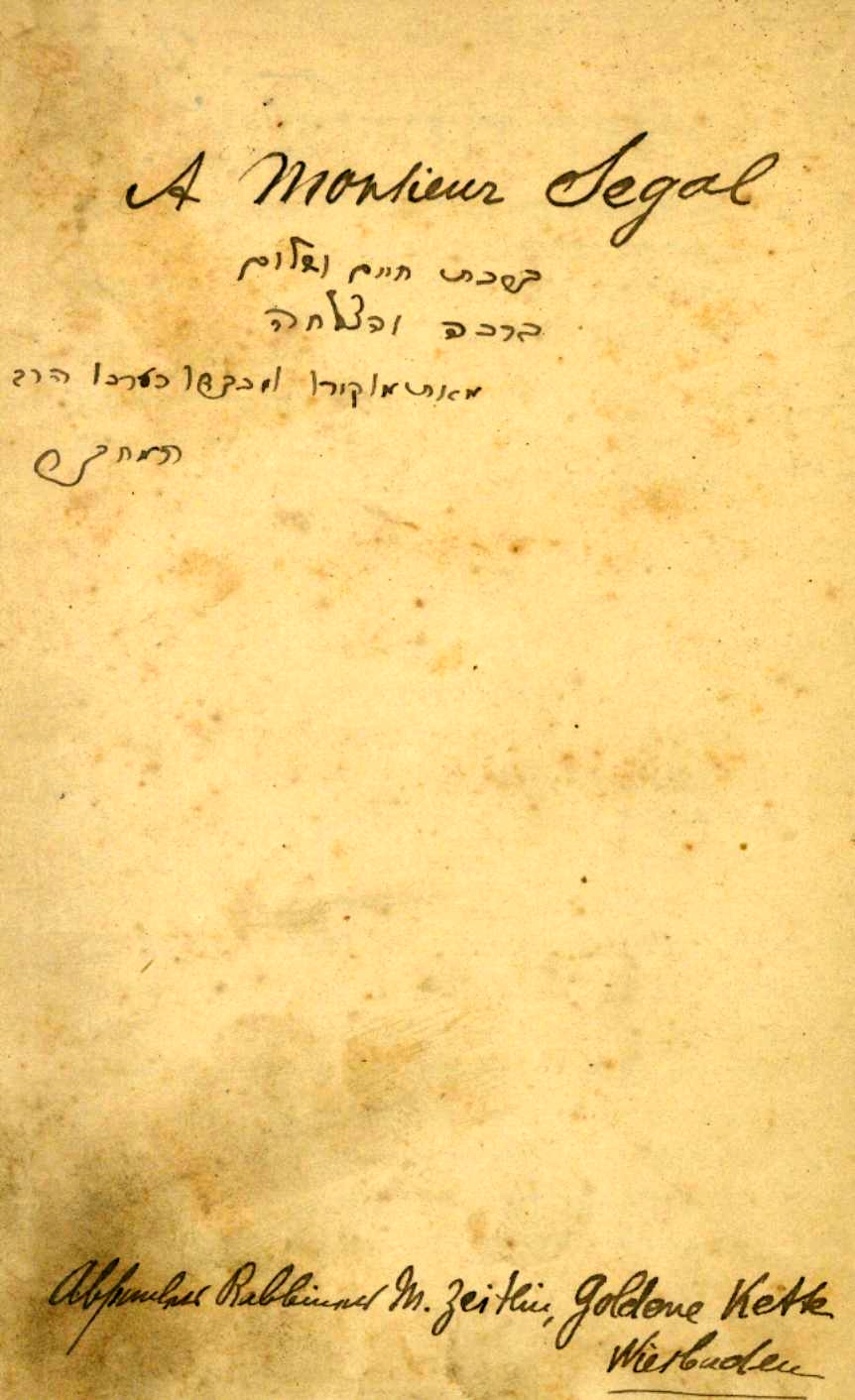 ויסבאדן היא עיירת נופש מפורסמת בגרמניה. המחבר ישב שם, כנראה במלון בשם "שרשרת הזהב". הספר נשלח לאדון סגל, ככל הנראה איש צרפתי (מונסיניור – פירושו בצרפתית אדון).