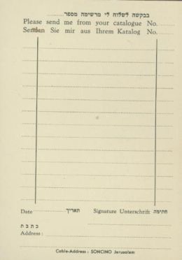 גלויה המצורפת לכל רשימת ספרים לצורך הזמנה בדואר חוזר.