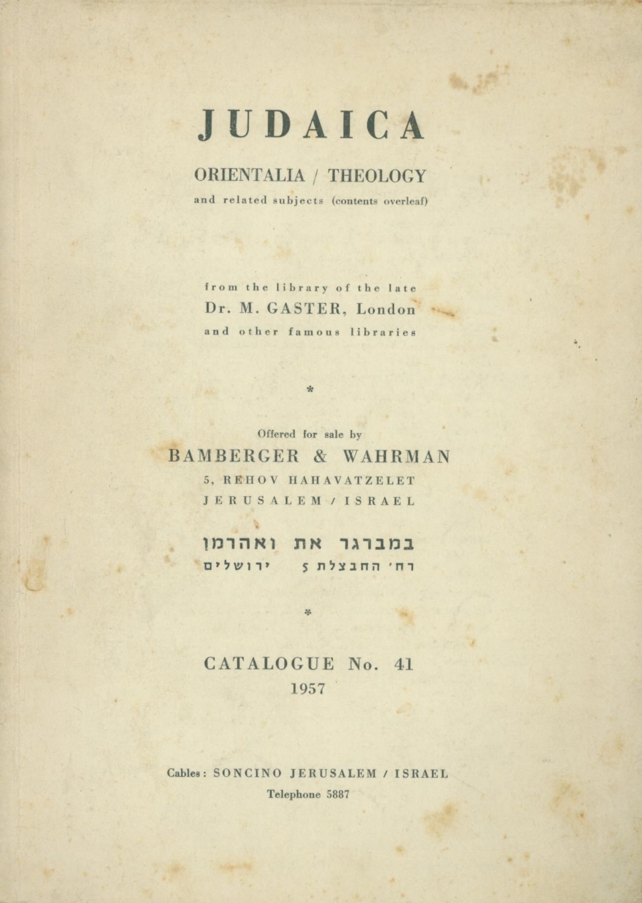 הקטלוג האחרון: מס' 41 משנת 1957. מוצעים למכירה פריטים מספרייתו של חוקר הפולקלור היהודי ד"ר משה גסטר מלונדון.