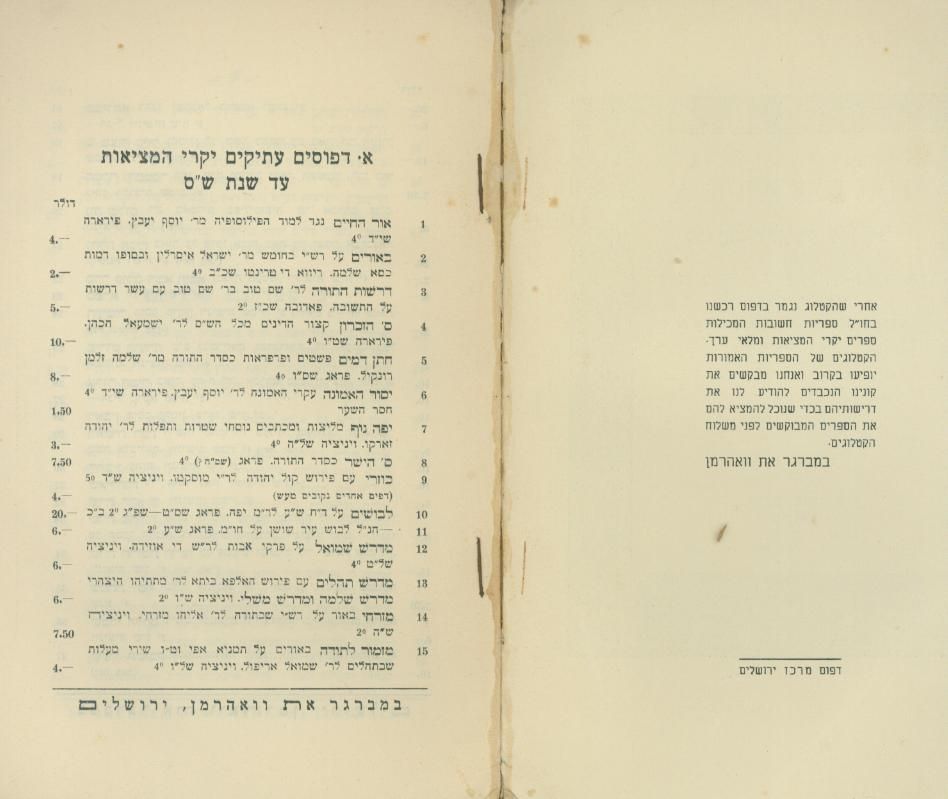 קטלוג הספרים הראשון שהוציאו במברגר את וואהרמן בשנת תרצ"ד (1934).