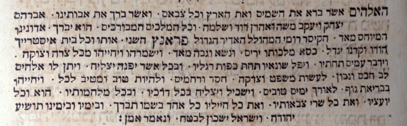הנותן תשועה למלכים וממשלה לנסיכים * מלכותו מלכות כל- עולמים * הפוצה את דוד עבדו מחרב רעה * הנותן בים דרך ובמים עזים נתיבה * הוא יברך וישמור וינצור ויעזור וירומם ויגדל וינשא למעלה את אדוננו פלוני ירום הודו: מלך מלכי המלכים ברחמיו יחיהו וישמרהו מכל צרה ויגון ונזק יצילהו * וידבר עמים תחת רגליו ויפיל שונאיו לפניו ובכל אשר יפנה יצליח * מלך מלכי המלכים ברחמיו יתן בלבו ובלב כל יועציו ושריו רחמנות לעשות טובה עמנו ועם כל ישראל * בימיו ובימינו תושע יהודה ישראל ישכן לבטח ובא לציון גואל * וכן יהי רצון * ונאמר אמן: