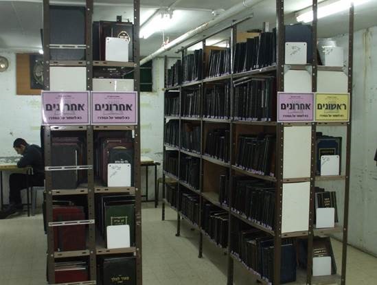 מראה ב"אוצר ה ספרים". שים לב לשלטים שעל המדפים.