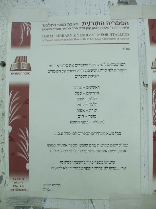 מודעה באוצר הספרים המפרטת את שיטת המיון