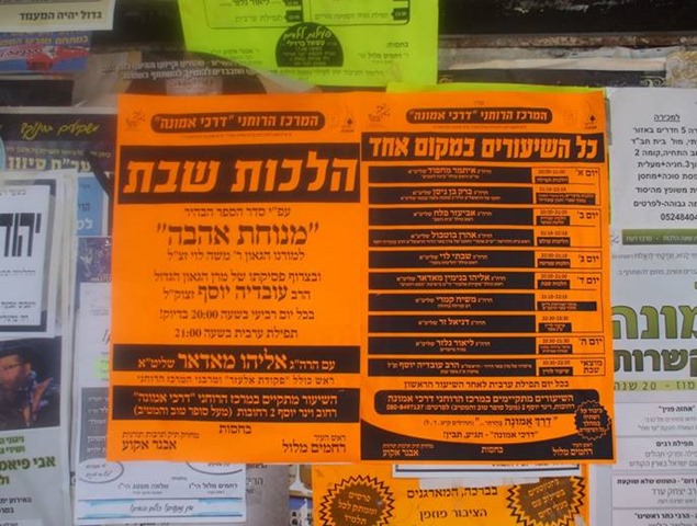 מודעה על אודות שיעורי תורה המתקיימים בבית מדרש הקרוי אמנם על שם הרב מרדכי אליהו, אך פועל ברוחו של הרב עובדיה יוסף. כפי שניתן לראות, רוב השיעורים הם שיעורי הלכה ושניים מהם מתמקדים בחיבורים של הרב עובדיה, אחד ב"חזון עובדיה" והשני ב"הליכות עולם". שיעור אחר, שקיומו מודגש במודעה, הוא בספרו של הרב משה לוי "מנוחת אהבה". מנסחי המודעה ערים לכך שספר זה שייך לחוג השפעתו של הרב עובדיה, אך גם לכך שלפעמים הוא חולק עליו, ומעירים שהלימוד בו יעשה בצירוף פסקי הרב עובדיה. המודעה שצולמה ביום ב תמוז תשע"ד, כעשרה חדשים אחרי פטירתו של הרב, מהווה דוגמא נאה להמשך מפעלו הרב בידי תלמידי ותלמידי תלמידיו ואת מקומם המרכזי של הספרים השונים במפעל זה.