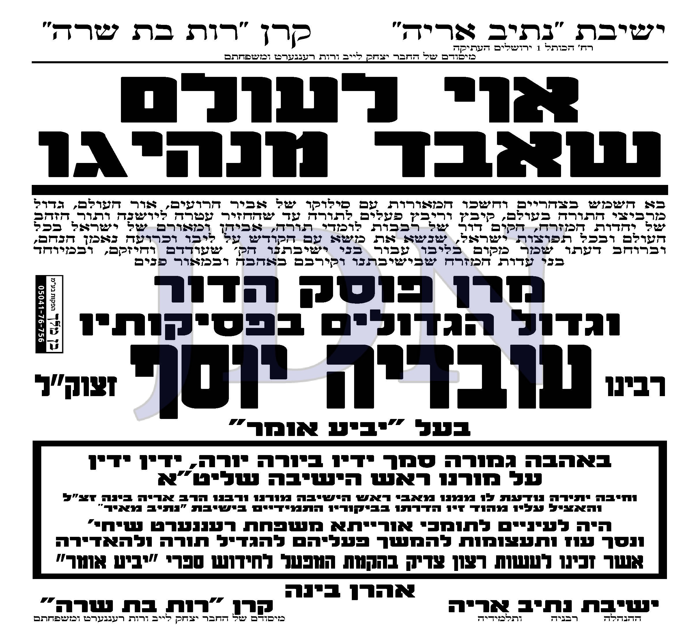 * הודעת המערכת: במאמר שילבנו מודעות אבל שפורסמו אחרי פטירת הרב עובדיה זצ"ל. למעט התמונה האחרונה (על הלכות שבת) שהיא שייכת למאמר וצורפה על ידי המחבר.