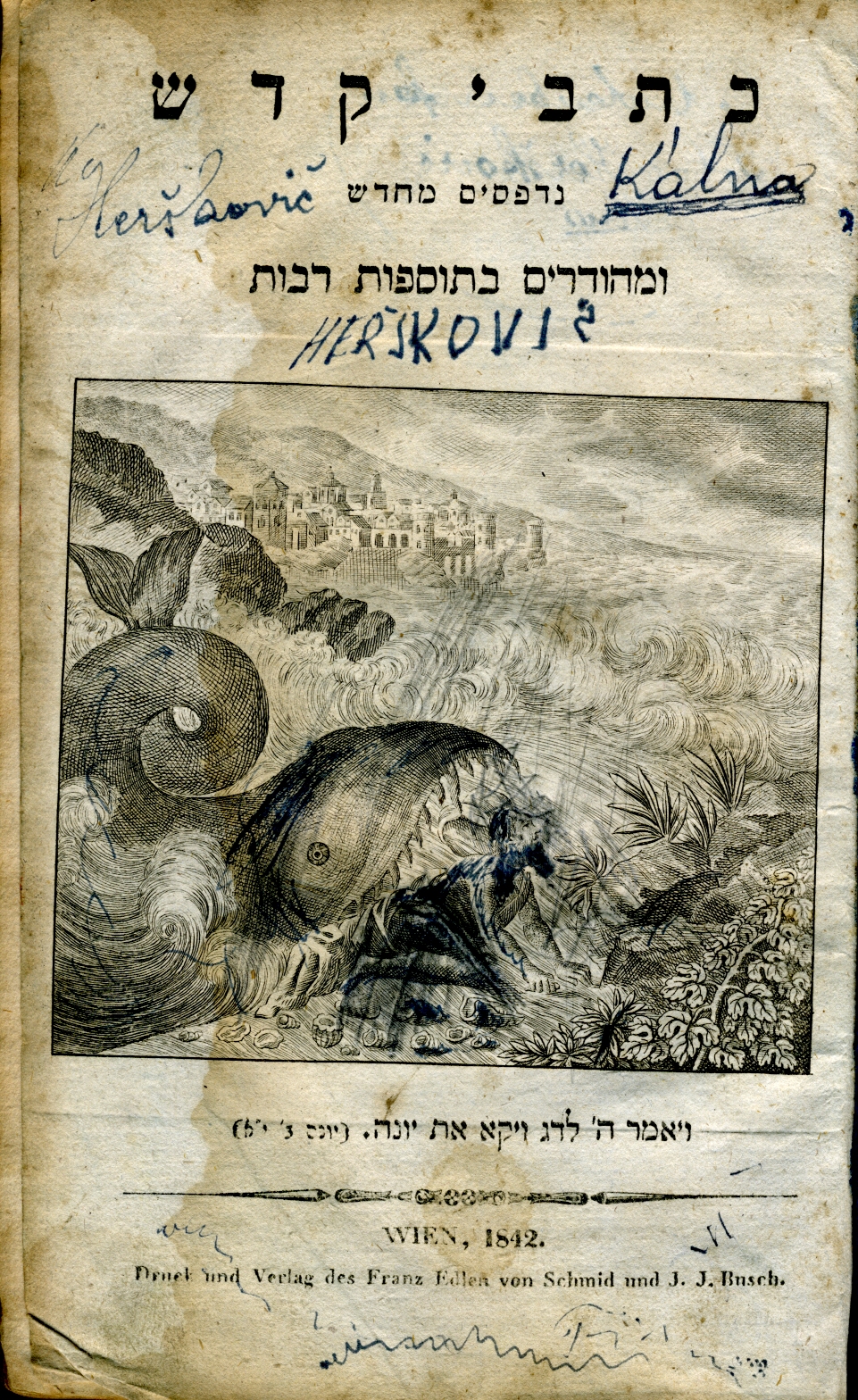 נתקלתי אתמול בספר תרי עשר כרך ב' ממהדורת וינה תר"ב (תרגום לגרמנית באותיות עבריות, לצד ביאור משולב ומבוא), שעל השער שלו יש איור מרשים של הדג המקיא את יונה אל החוף. (ממפעל הביבליוגרפיה למדתי שלכל אחד מהכרכים של מהדורה זו, נוסף בשער איור מעניינו של אחד מספרי התנ"ך שבכרך). מה שמעניין באופן אנקדוטלי, הוא שיד אלמונית טרחה להדגיש ליונה את הזקן וכן להלביש אותו בצורה מלאה יותר לעומת הסטנדרטים של המאייר… מעל לכך כתוב בכתב יד ילדותי 'הרשקוביץ', ומכאן אני למד שמי שעשה זאת היה כנראה בנו של בעל הספר.