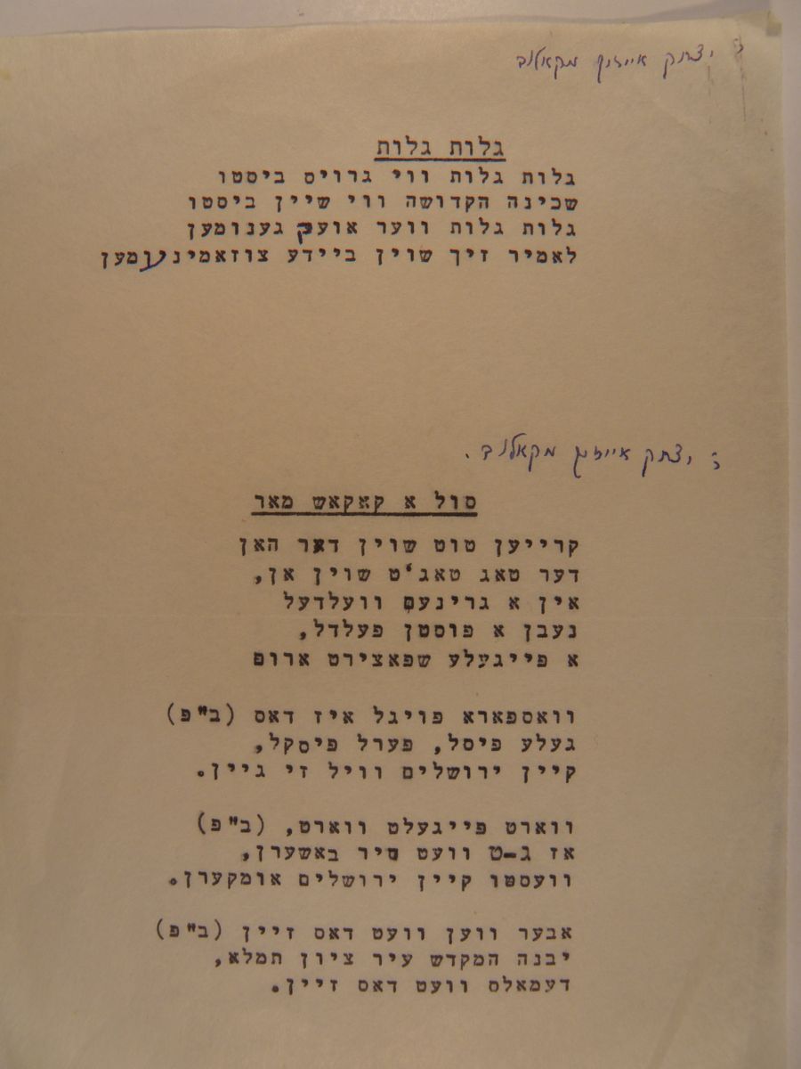 ואכן באותו תיק שבארכיון הנוקדים נמצאו עוד שני שירים של הרועה מקאליב : "גלות גלות" (ביידיש) ו- "סול א קאקאש מאר" (בהונגרית, קרא התרנגול), מודפסים על דף סטנסיל עם המילים "ר' יצחק אייזיק מקאלוב" בכתב ידו של ישראל פינצ'וק (תמונה מספר 7).