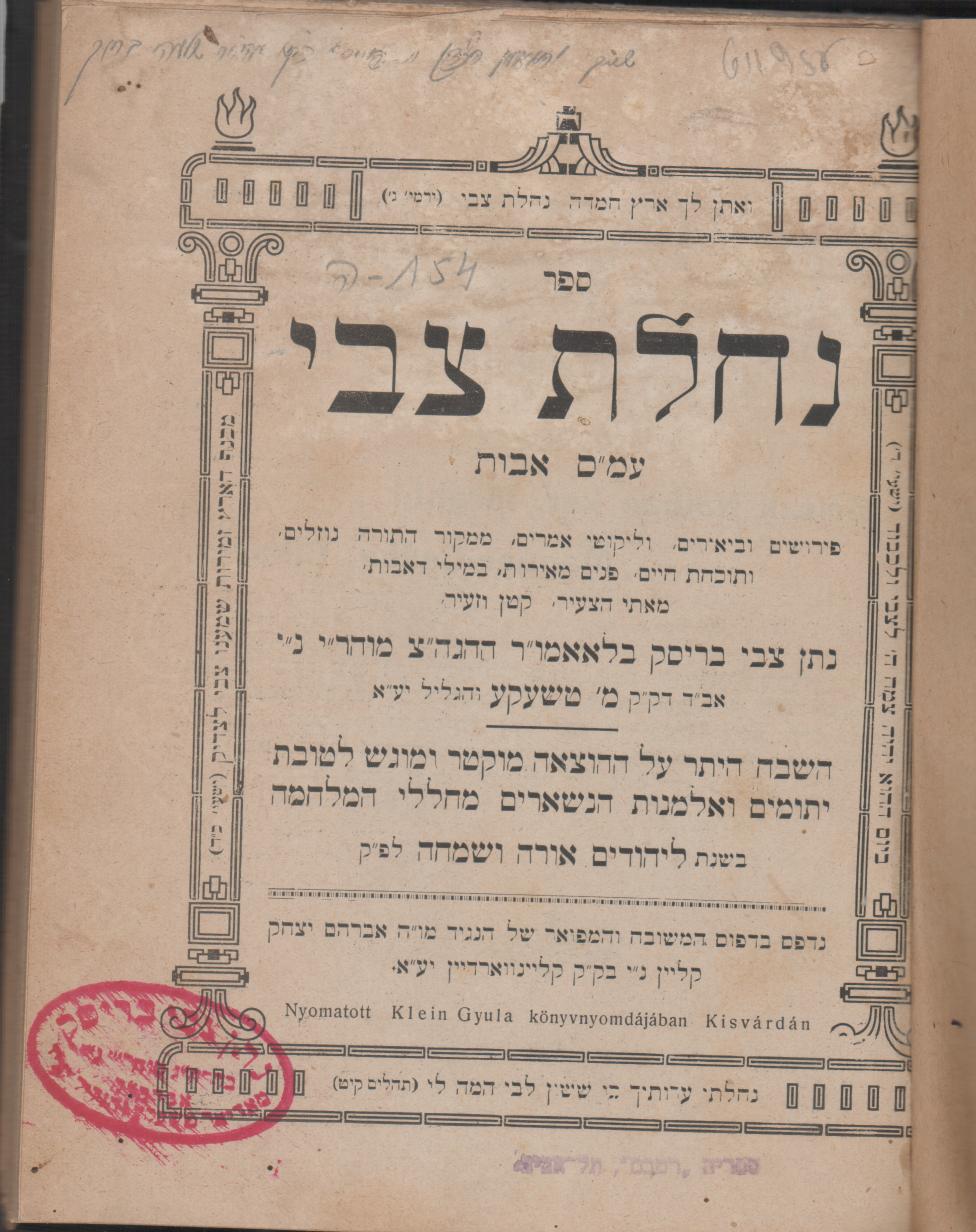 9. נחלת צבי לר' נתן צבי בריסק. קליינוורדין, דפוס א. י. קליין,  תרע"ו (1916).