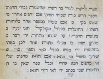 "…גם צריך להודיע כי שמעתי שאחד מן לומדי תורה בשמו ר' משה טיקטין הדפיס באמשטרדם ספר אחד על תכונה על שמי בלי ידיעתי ובלי רשותי, והאיש היה פעם אחת אצלי ואמר לי שקיבל ספר הנזכר מאחד מתלמידי[7], ואמרתי לו שספר הזה היה ביד כל תלמידי והיה להם לזכרון על מה ששמעו ממני פא"פ (פנים אל פנים – ע"ר), כי באמת אינו ראוי לקרוא אותו בשם ספר, על כן כל מי שקנה ספר הנזכר אל יאשימני שיצא לאור דבר שאינו מתוקן כי לא היה דעתי מעולם שיבא ספר הלז אל הדפוס בלי הוספה, ואלקי אבי יהיה בעזרי להצילני שלא אשיג גבול אחרים אמן".