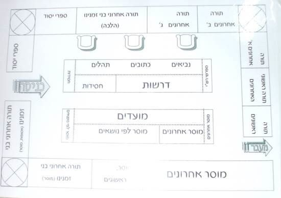 "אוצר הספרים" מתפרש על פני כשבעה חדרים שברובם מוצבים מדפי עץ היוצרים מסדרונות צרים. בין המדפים גומחות בהן מוצבים שולחנות עיון לבודדים. חדר העיון "עטרת שלמה" רחב יותר ובמרכזו מוצב שולחן שמסביבו כמה כסאות. כמקובל גם בספריות ישנו מדף של ספרים חדשים. לקראת כל חג מרוכזים הספרים העוסקים בו במדפים מיוחדים כדי לאפשר גישה מהירה ונוחה אליהם ולעסוק בהלכות החג ובענייניו בסמוך לו.