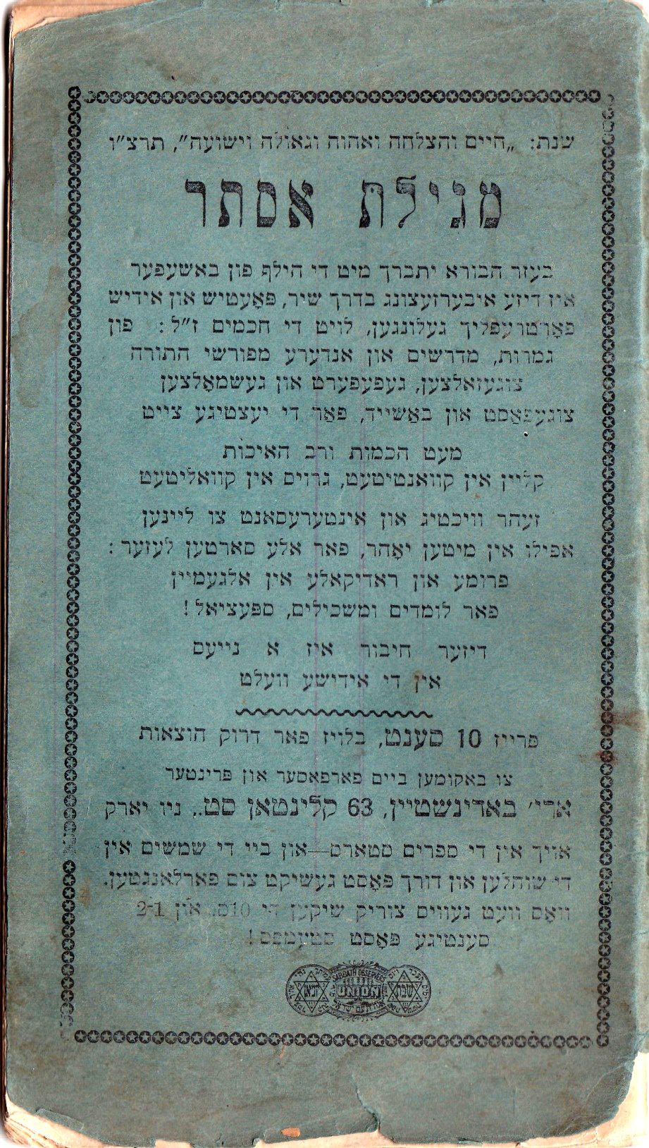 שנת: "חיים והצלחה ואחוה גאולה וישועה" תרצ"ו מגילת אסתר בעזר הבורא יתברך מיט די הילף פון באשעפער איז דיזע איבערזעצונג בדרך שיר, פּאָעטיש און אידיש פאָרטרעפליך געלונגען, לויט די חכמים ז"ל: פון גמרות, מדרשים און אנדערע מפורשי התורה צוגעזאלצען, געפעפערט און געשמאָלצען צוגעפאַסט און באַשייד, פאר יעצטיגע צייט מעט חכמות ורב האיכות קליין אין קוואנטיטעט, גרויס אין קוואליטעט זעהר וויכטיג און אינטערעסאנט צו ליינען אפילו אין מיטן יאָהר, פאר אלע סארטען לעזער: פרומע, און ראדיקאלע אין אלגעמיין פאר לומדים ומשכילים, ספּעציאל! דיזער חיבור איז א נייעס אין די אידישע וועלט פּרייז 10 סענט, בלויז פאר דרוק הוצאות צו באקומען ביים פארפאסער און פּרינטער ארי' באדינשטיין, 63 קלינטאן סט., ניו יארק אויך אין די ספרים סטארס – און ביי די שמשים אין די שוהלען און דורך פּאָסט געשיקט צום פארלאנגטען. וואָס וועט געוויס צורריק שיקען די 10ס. און 1 – 2 סענטיגע פּאָסט סטעמפס! |