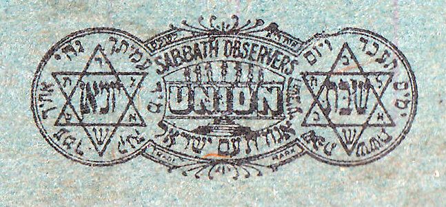 סמל המתחלק ל-3 חלקים ובו: (מימין) – מגן דוד ובתוכו: שבת, סביבו: ששת ימים תעבד ויום השביעי שבת. (משמאל) – מגן דוד ובתוכו: יוניאן, סביבו: קנה מיד עמיתך וחי אחיך עמך. במרכז (בין שני מגן דוד) – SABBATH OBSERVERS ; UNION ; אגודת עם ישראל ; TRADE MARK.