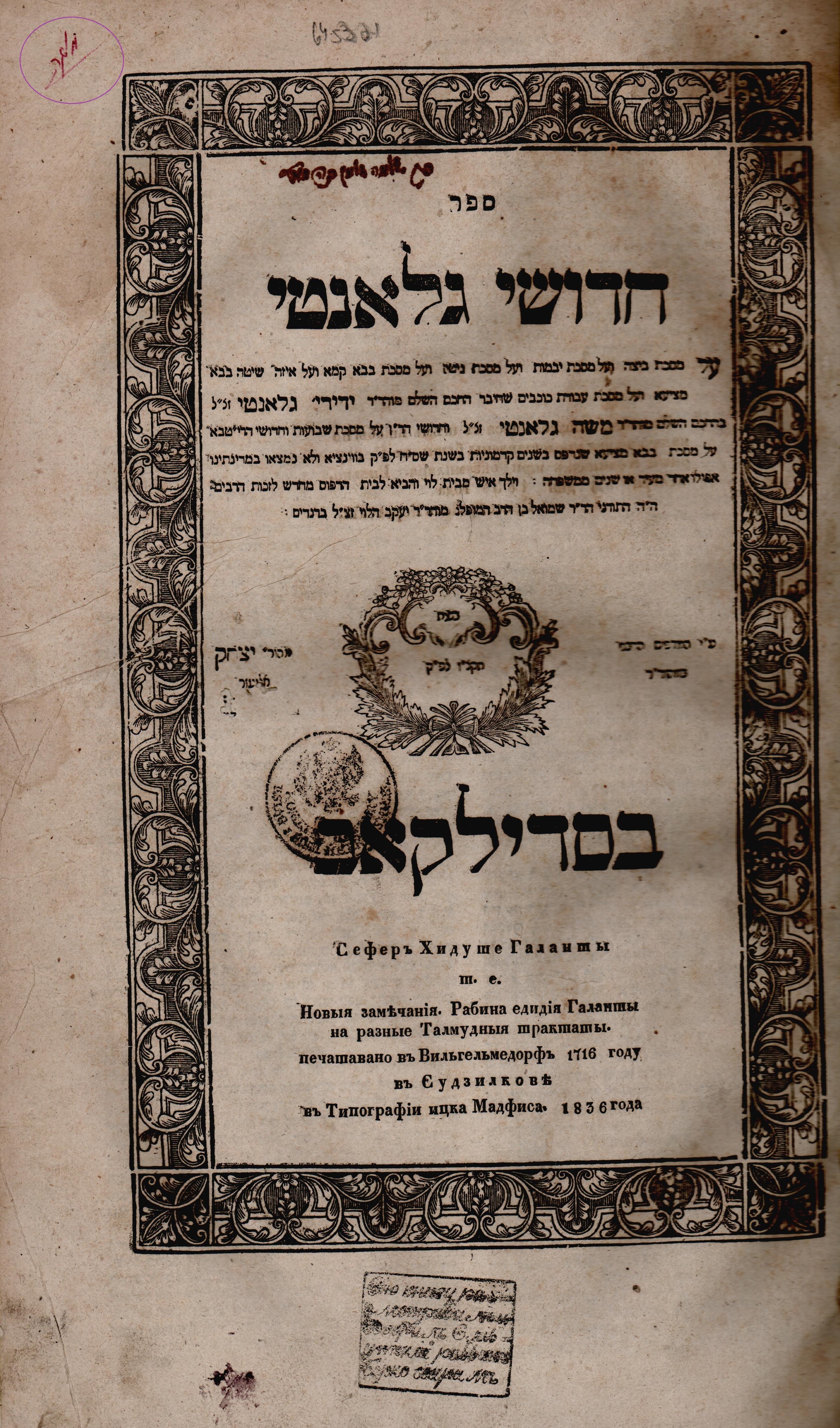 גלנטי, ידידיה. חדושי גלאנטי. סדילקוב. תקצ"ו 1836
