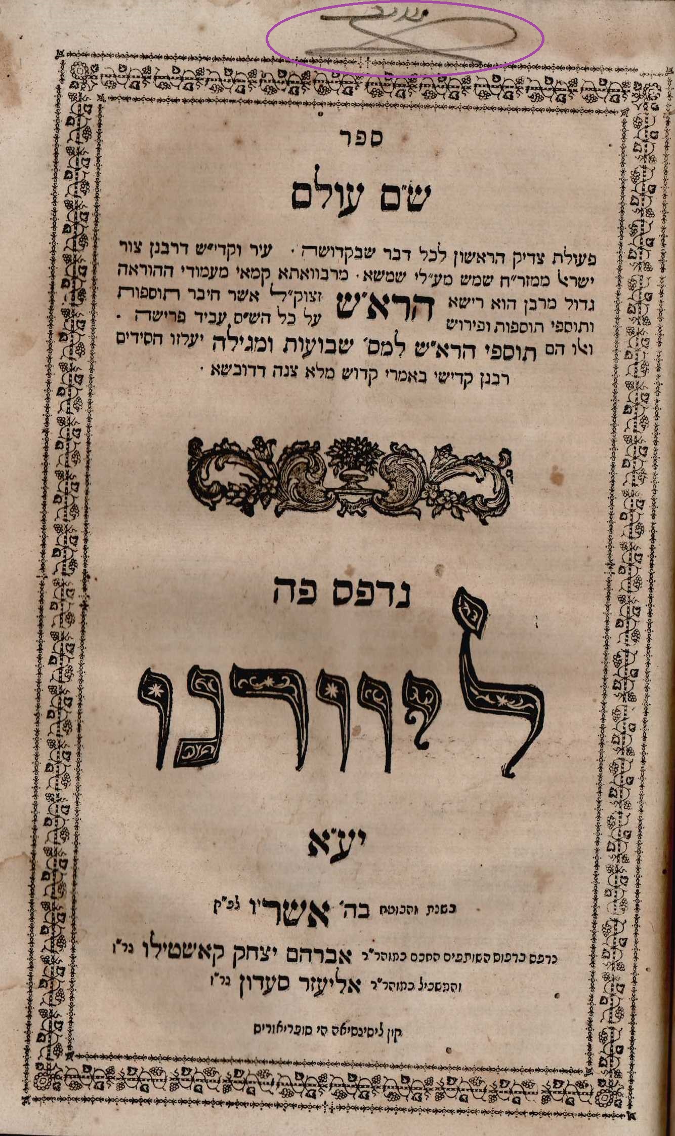 אשר בן יחיאל. ש"ם עולם. ליוורנו. תר"א 1841.