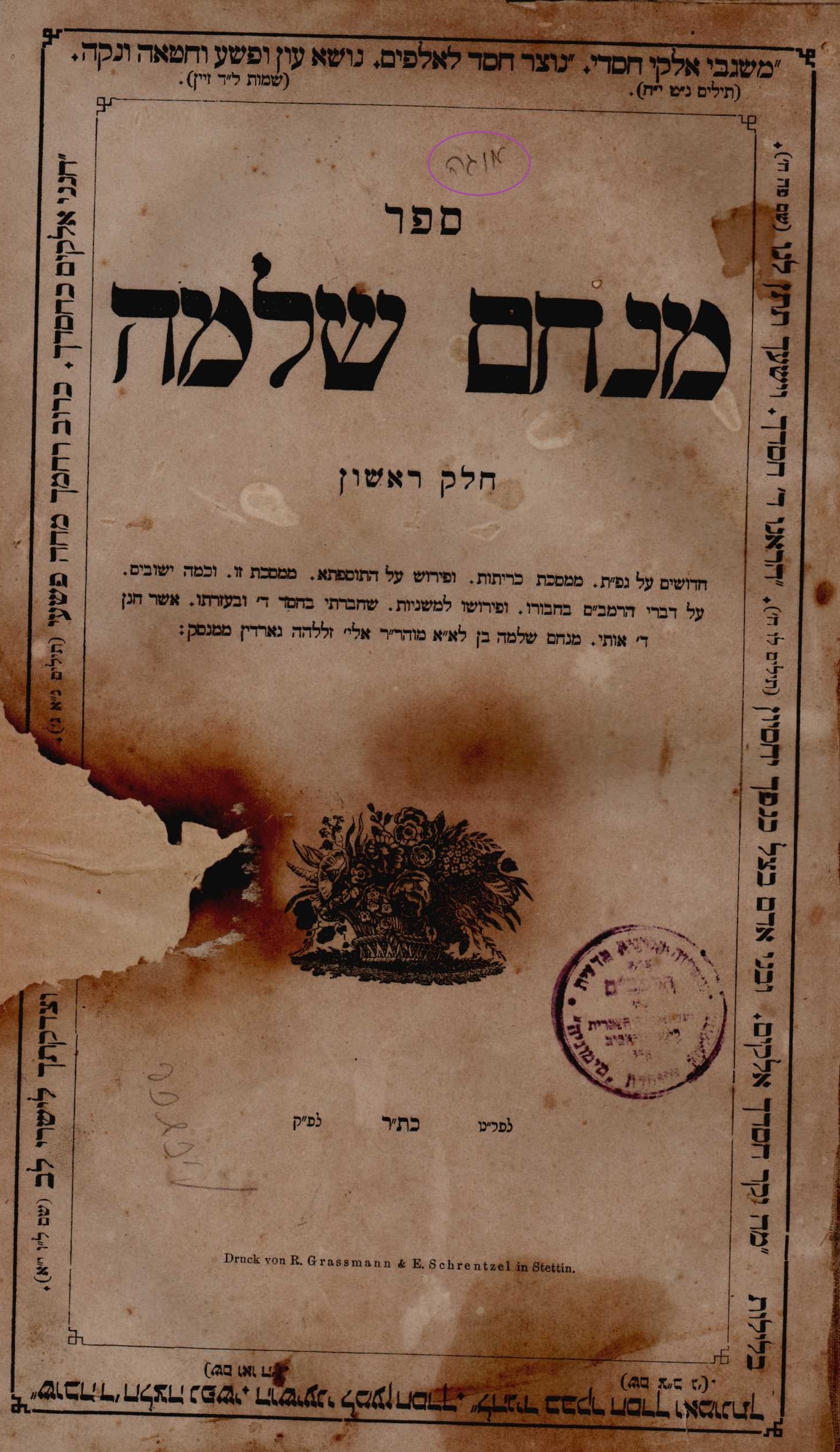 גורדין, מנחם שלמה. מנחם שלמה. שטטין. תר"כ 1860
