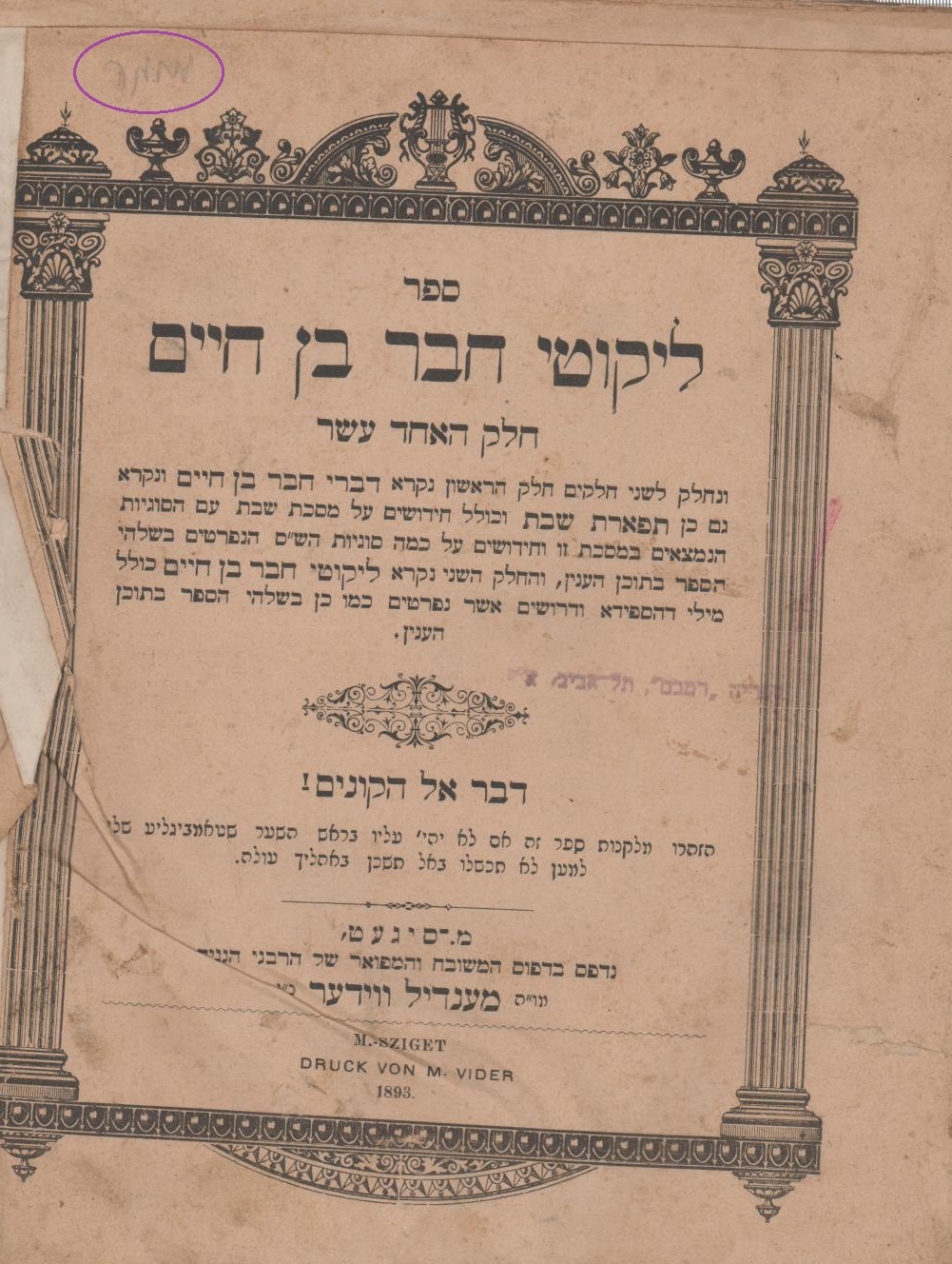 פלויט, חזקיה פיבל. לקוטי חבר בן חיים. סיגט. תרנ"ג 1893