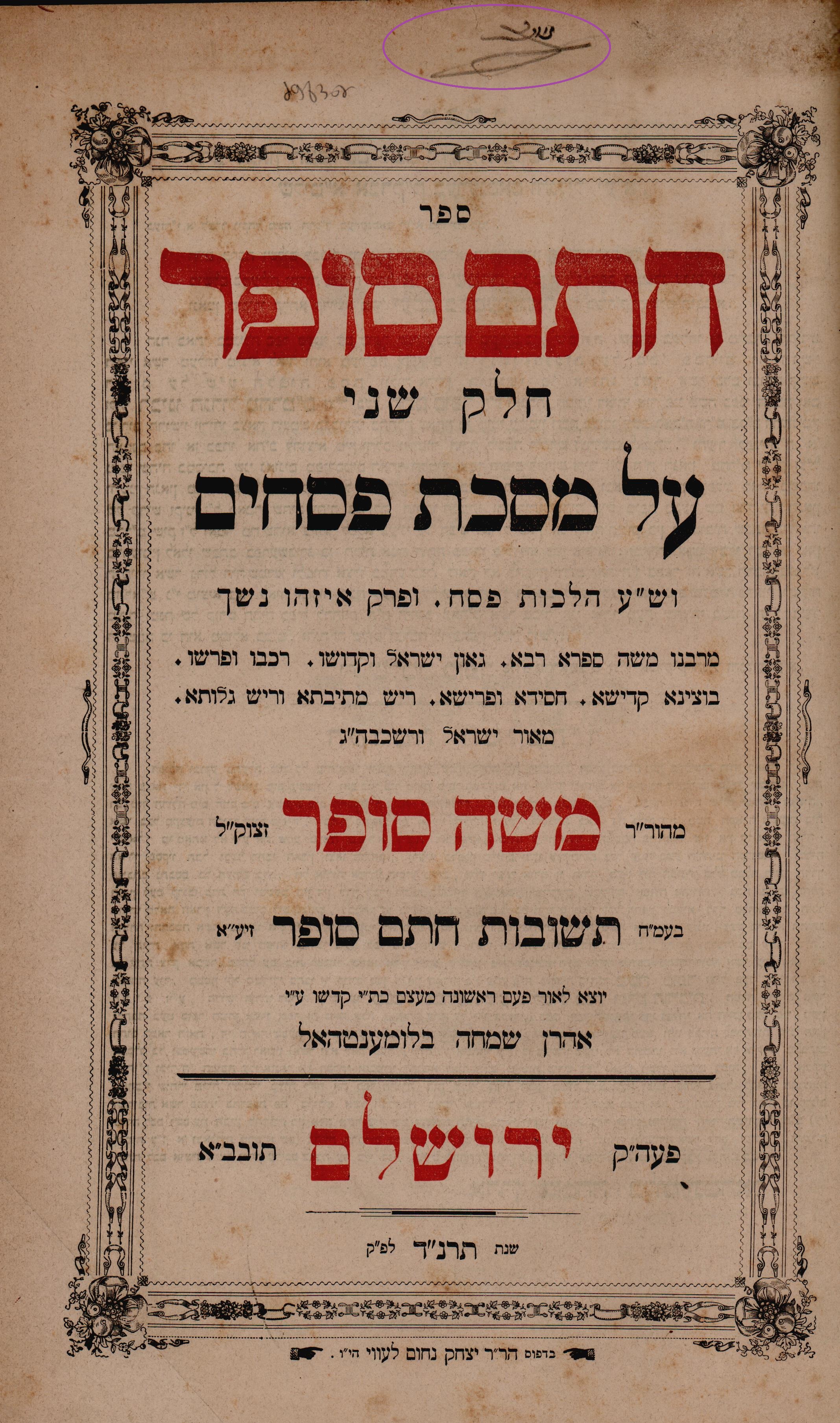 סופר, משה. חתם סופר. ירושלים. תרנ"ד 1894