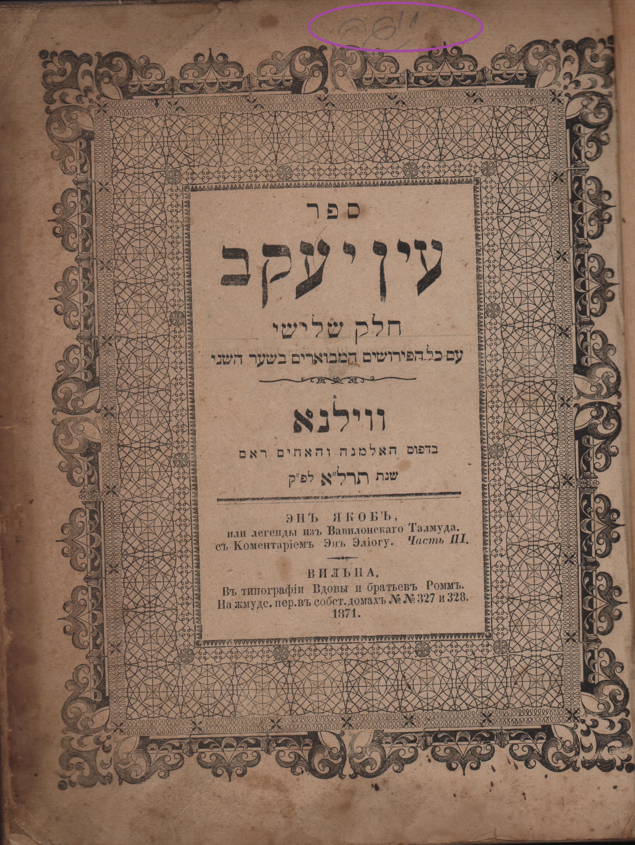 עין יעקב (חלק שלישי). וילנה, תרל"א 1871.